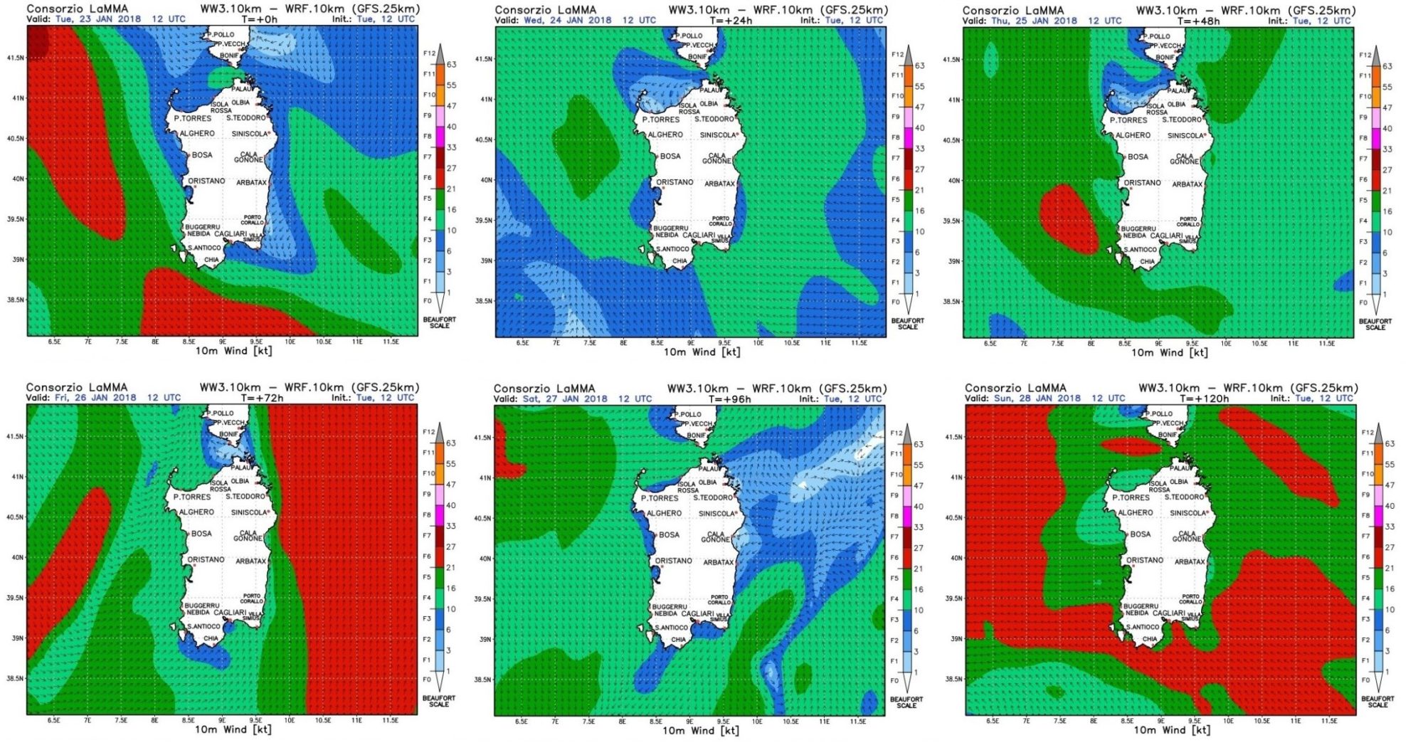 Als Beispiel für das, was oben gesagt wurde, können Sie sich das folgende Bild ansehen. Es zeigt die Windprognose für die Tage vom 23, 24, 25, 26, 27, 28. Januar 2018: Diese Vorhersagen zeigen Winde, die jeden Tag Richtung und Intensität ändern.